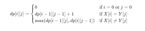 두 문자열 X와 Y에 대해, dp[i][j]가 X의 처음 i번째 문자와 Y의 처음 j번째 문자까지 고려했을 때의 LCS 길이라고 할 때, 점화식은 다음과 같습니다.